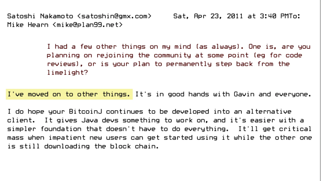 Satoshi also posted a forum post on Bitcointalk a few days later, on April 26, 2011, saying that he had moved on to other projects and the project was in good hands with Gavin and others. The exact email is shown in the image above.